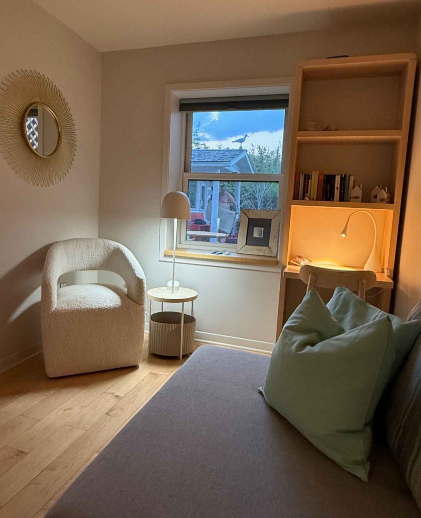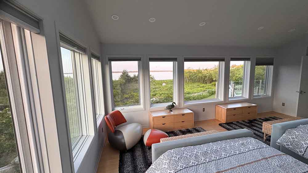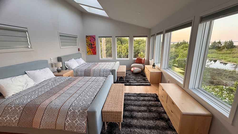 La grande chambre à coucher principale avec deux lits doubles a une baie vitrée qui donne sur les dunes et la mer. Les véluxes au-dessus du lit permettent d’admirer le ciel nocturne étoilé et la voie lactée, dont la clarté est impressionnante en Nouvelle-Écosse. La salle de bain est équipée de deux lavabos, d’une grande douche et un WC.