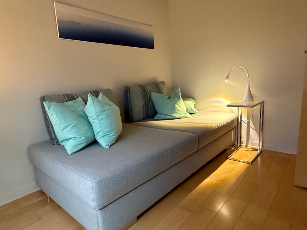 Entre le salon et la chambre à coucher principale se trouve un petit salon de lecture avec un canapé confortable et une bibliothèque avec un grand choix de livres.